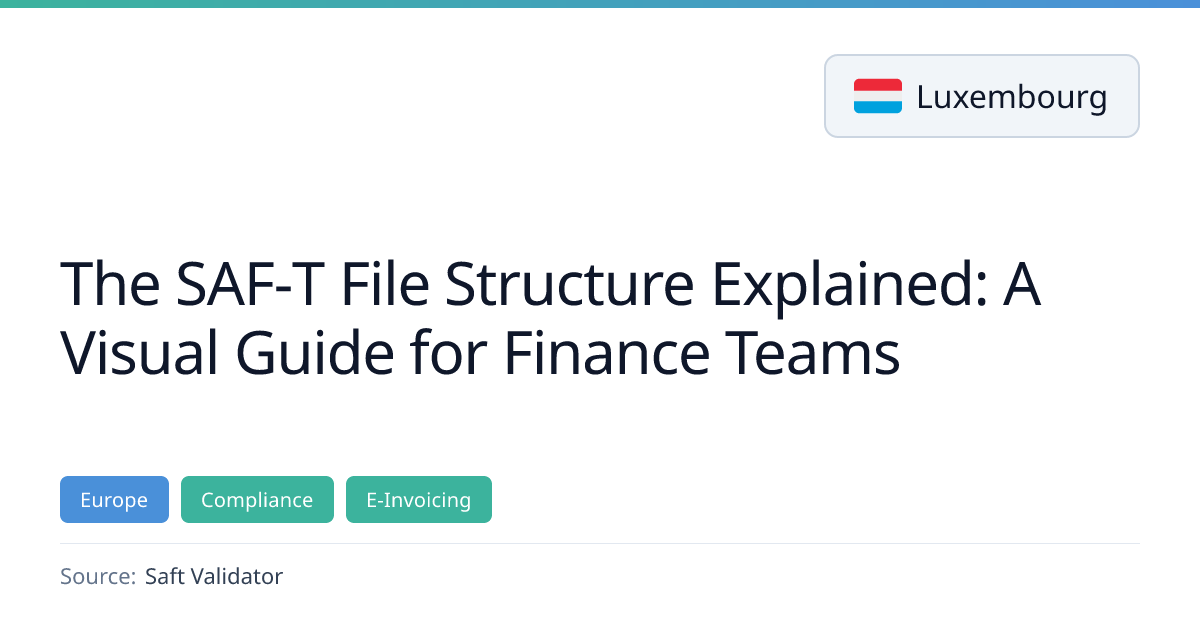 This guide details the Standard Audit File for Taxation (SAF‑T) structure, outlining its four main sections—Header, MasterFiles, GeneralLedgerEntries, and SourceDocuments—and the reference data tables required for compliance. It explains how each transaction must link back to MasterFiles and highlights common validation errors, with specific reference to Luxembourg’s FAIA variant and its tax rates.