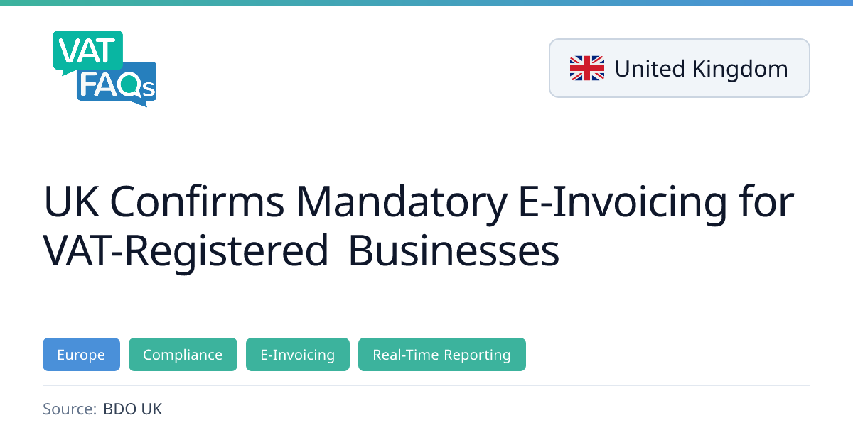 Following consultation, the UK government confirmed mandatory e-invoicing for all VAT-registered businesses, with a phased rollout starting April 2028 for the largest businesses and full mandate by April 2029.