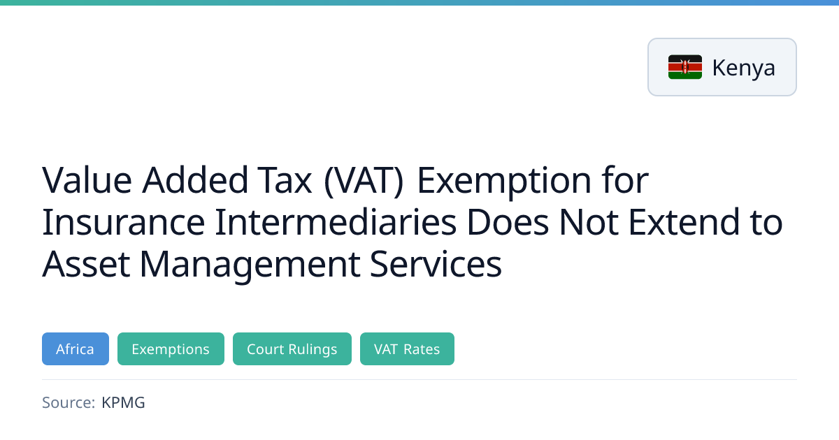 Kenyan KPMG commentary analyzes the Tax Appeals Tribunal decision that clarified the VAT treatment of insurance intermediaries. The Tribunal ruled that while insurance brokerage services remain exempt, asset management services are taxable at the standard 16% rate. The decision also highlights the High Court's 2021 ruling restoring the exemption and the appellant's unsuccessful deregistration attempt.