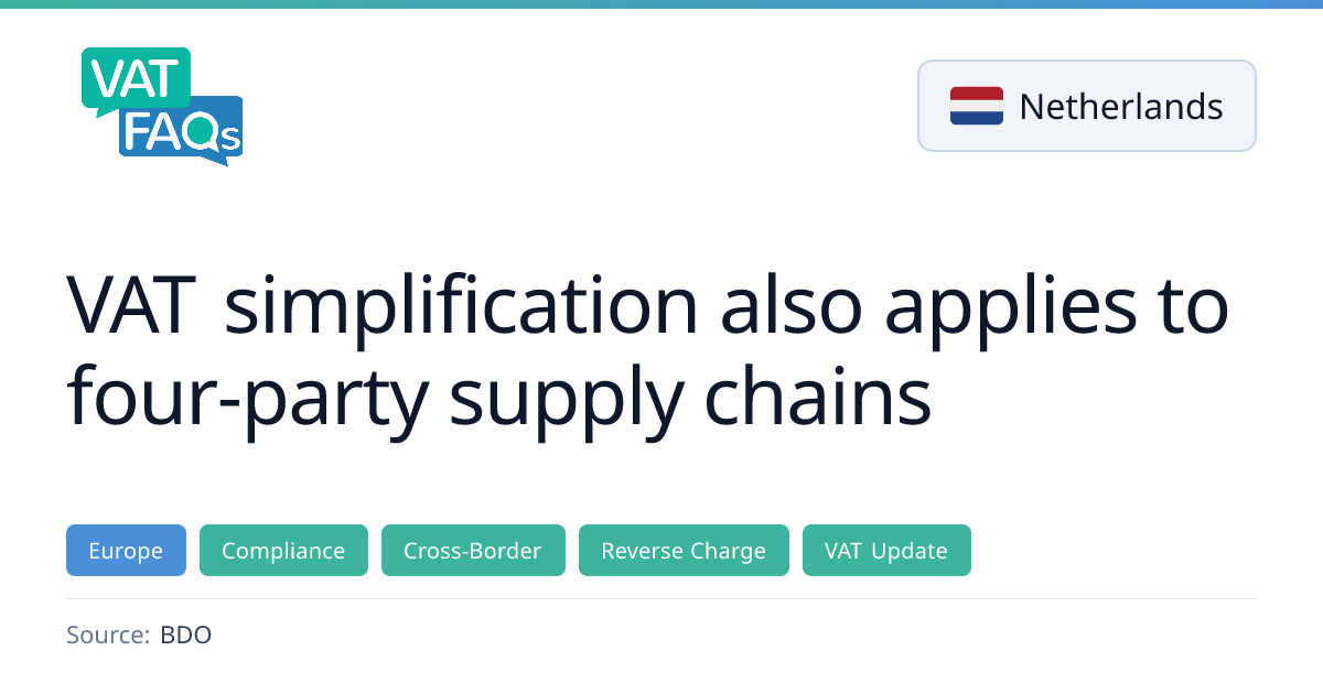 The EU General Court clarified that simplified triangulation can be used in four-party supply chains if the third party has disposal power, even when goods are delivered to a fourth party. Dutch policy confirms this but adds an establishment requirement for party C, which may be overridden by the EU VAT Directive. The ruling also allows Member States to refuse the scheme in cases of VAT fraud.