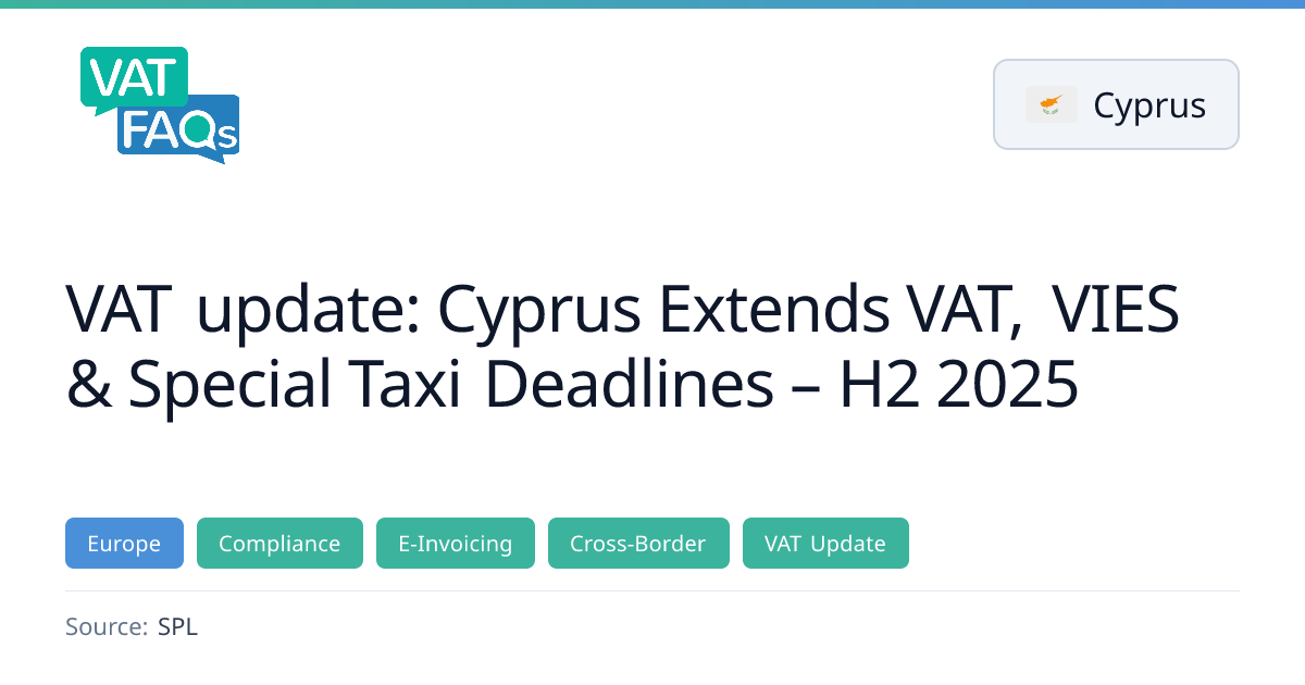 Cyprus has extended deadlines for VAT, VIES, and the Special Taxi Scheme to 20 January 2026, allowing submissions and payments without penalties. Businesses must be aware of the new penalties that will apply after this date. The extension covers VAT returns for the period ending 30 November 2025, VIES returns for December 2025, and the flat‑rate scheme for urban taxis from 1 July to 31 December 2025.