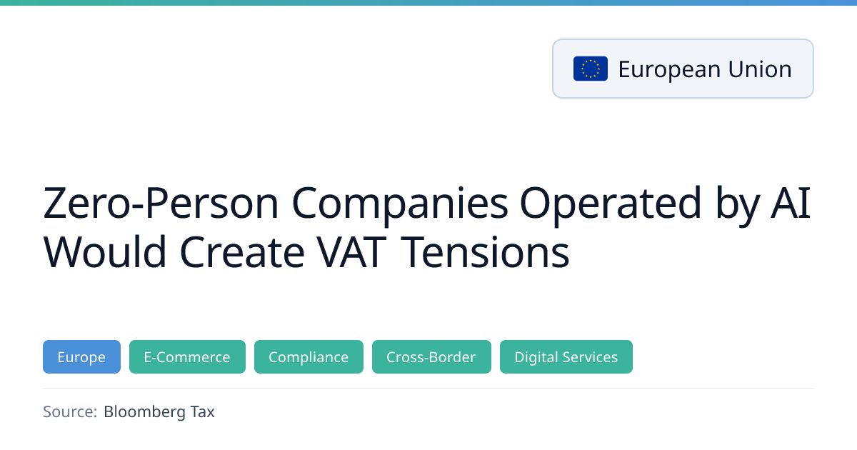 The article examines how fully automated, AI‑run companies—termed zero‑person companies—challenge existing VAT rules. It explains that while such entities can perform all operational tasks, they still require a human link for legal accountability, and their place of establishment for VAT purposes is determined by where central administration effectively occurs, often defaulting to the registered office. The piece also discusses the low likelihood of fixed establishments arising solely from cloud infrastructure and outlines compliance implications for tax authorities.