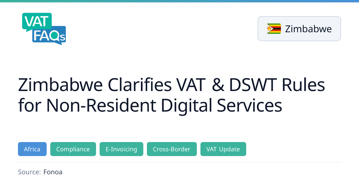 Zimbabwe’s tax authority has clarified that non‑resident digital service providers must remain VAT‑registered if their annual turnover from services consumed in Zimbabwe exceeds USD 25,000, even after the introduction of Digital Services Withholding Tax (DSWT). The DSWT withholding amount is credited against the supplier’s VAT liability, but all compliance obligations, including fiscalisation, continue to apply. The fiscalisation mandate has been live for all VAT‑registered taxpayers since June 2025.